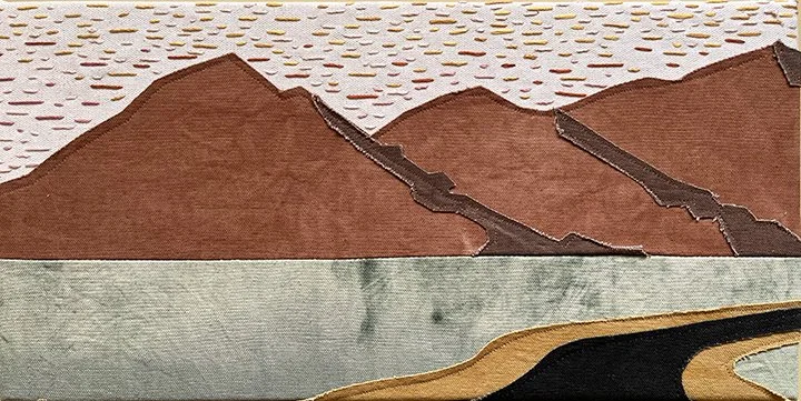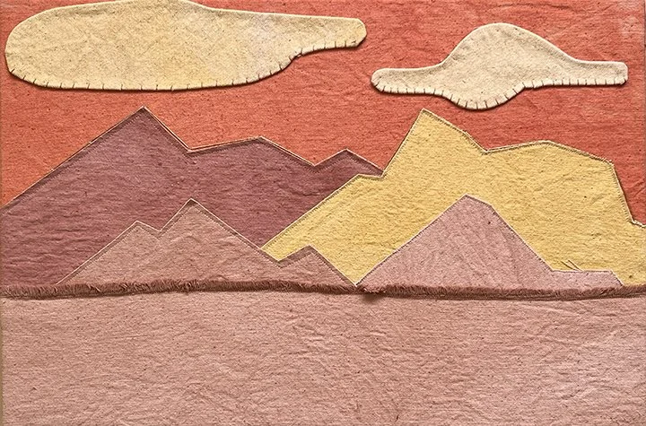 As she took the drives from Dallas and Bisbee during the move, she studied the landscapes and was inspired to use fabrics dyed with natural dyes to create the textures and scenes of the deserts.