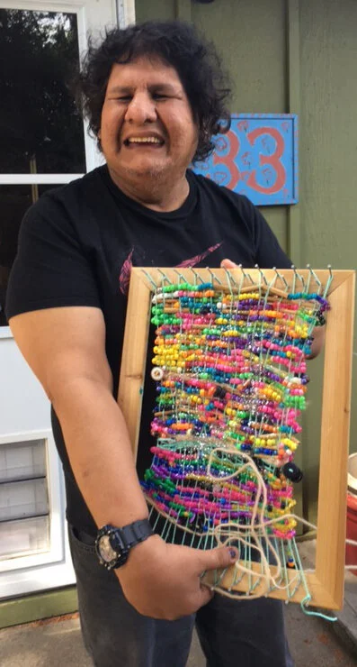 We love Ricky Bearghost in Portland, Oregon! He usually can be found most days working at the Portland Art and Learning Studios, but as many of us, Ricky is currently working at home. The folks at the Studios fashioned a small loom for Ricky to easily use and work from home and he has been turning out some great small jewels. We have been looking forward to showing these! They are so beautiful, personal, and an affordable way to have something cool come in the mail. You can hang them anywhere; and as you can see Ricky gets so much joy from making these pieces.